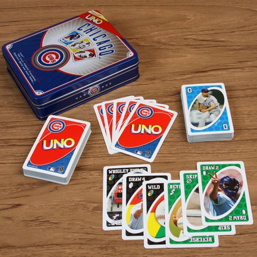UNO customized for Chicago Cubs fans. Includes an exclusive card. Comes in a detailed deluxe collector's tin. For 3-6 players ages 7 years and up.